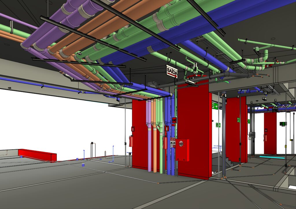 Integramos todas as disciplinas técnicas do projeto como estrutura, elétrica, hidráulica, gás, ar-condicionado e combate a incêndio dentro de um único modelo BIM.